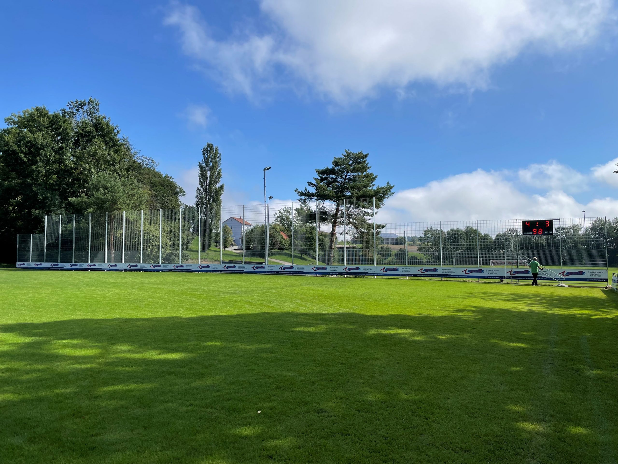 Auch die Bandenwerbung der Firma Treffler sowie die Anzeigetafel haben wieder ihren Platz am neuen Zaun gefunden. Bei den ersten Heimspielen konnte der Ballfangzaun bereits seine Standfestigkeit erfolgreich unter Beweis stellen.